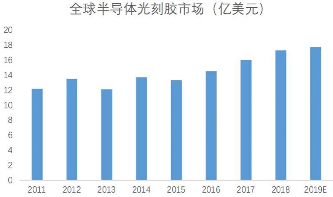 由于半導體光刻膠主要應用于半導體制造,故半導體光刻膠市場與對應晶圓廠產能密切相關。根據(jù)SEMI公布數(shù)據(jù),2018年全球半導體光刻膠市場共17.3億美元,同比增長2.3%。自2016年來,全球光刻膠市場年均復合增長率為9.23%。