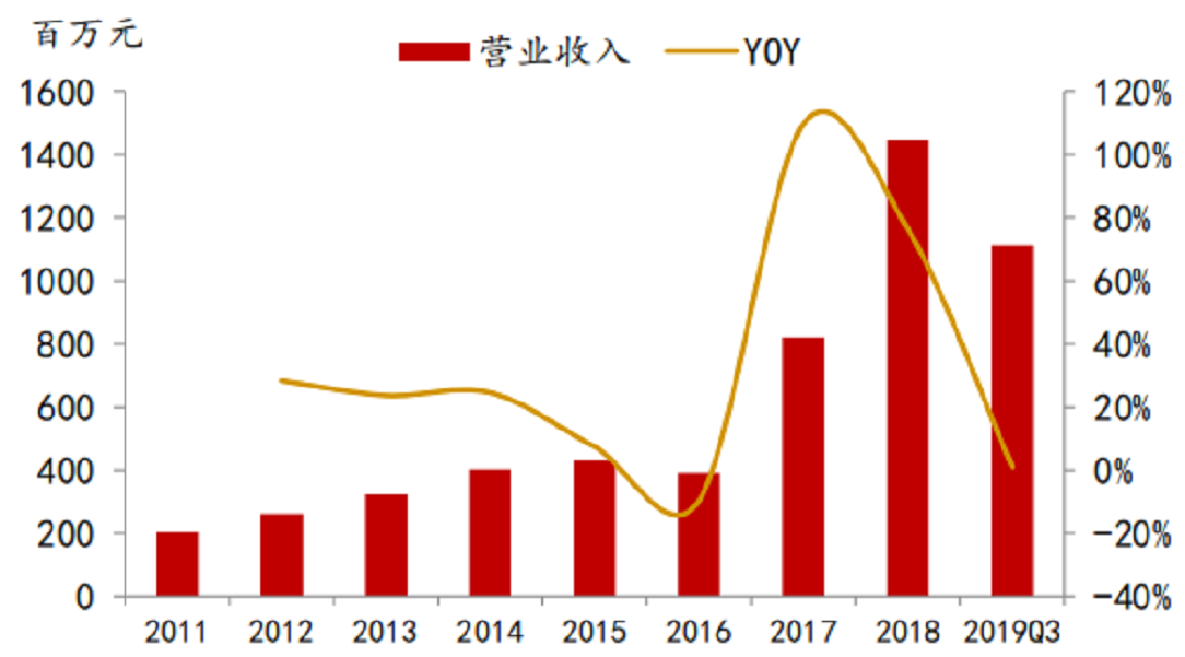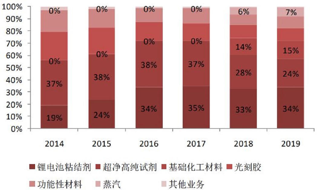 2018年,公司實現(xiàn)營業(yè)收入14.46億元,同比增長76.23%,實現(xiàn)歸母凈利潤2.84億元,同比增長239.37%。其中電子化學品占公司總營收的64.9%,是公司最主要的收入來源。